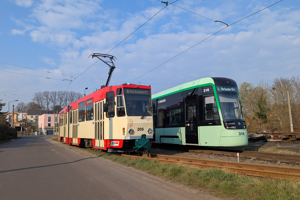 treffen sich die Wagen 205 (als Linie 4) und 316 auf dem Gleisstumpf (als