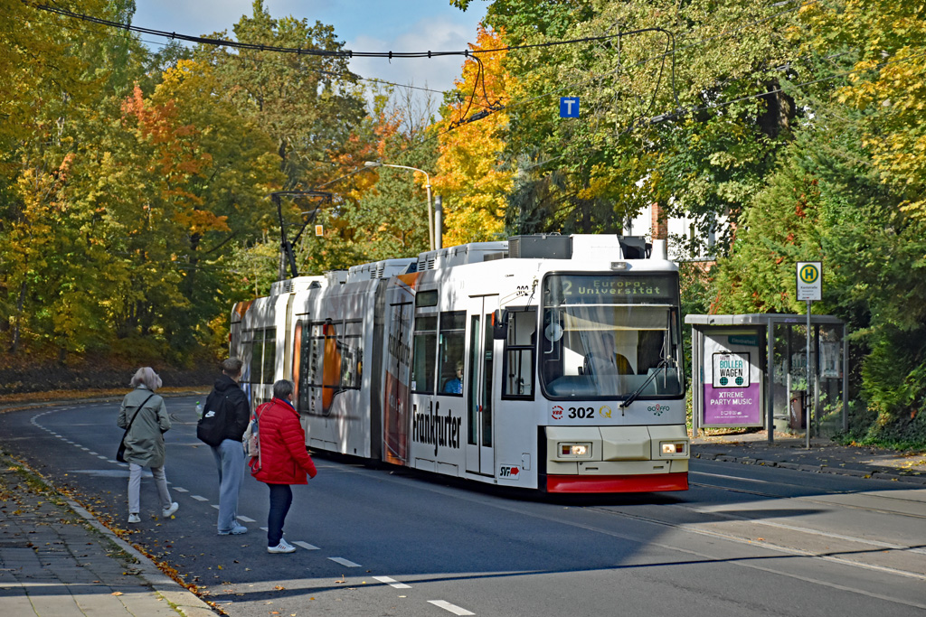 Niederflurwagen 302 auf der Linie 2 an der Europa-Universität am 24.11.07. |