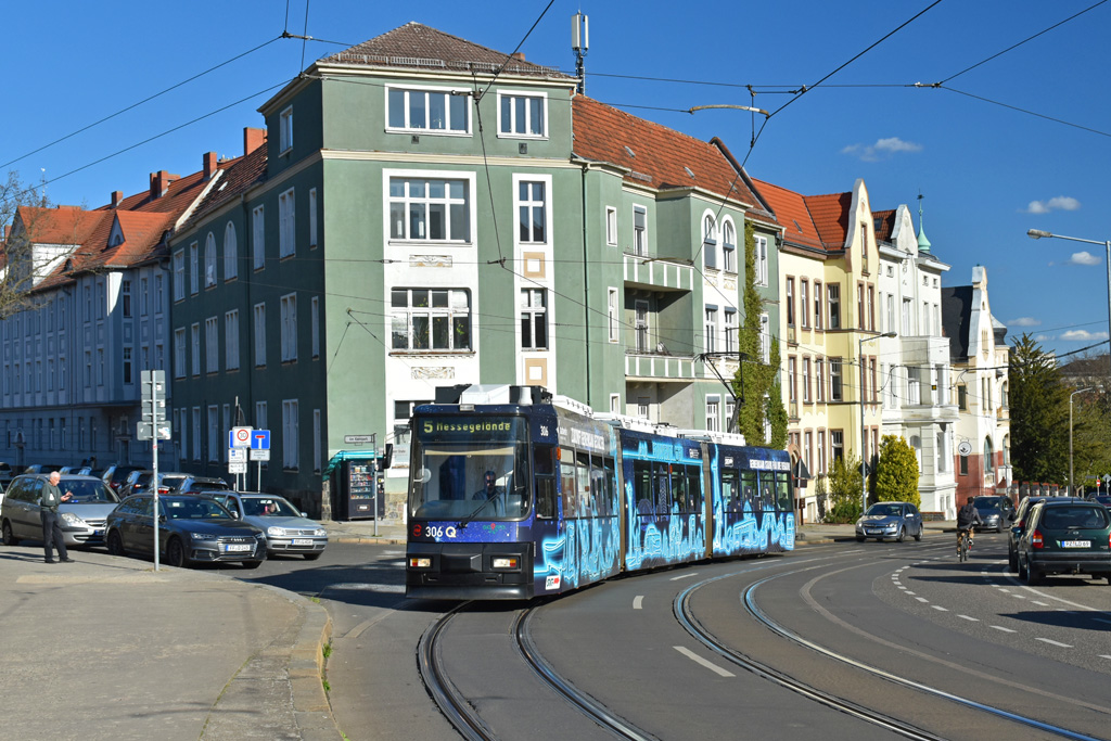 Niederflurwagen 306 am 20.06.2020 kurz nach der Haltestelle Kießlingplatz. |