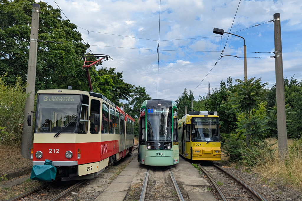 bestehend aus Tatrawagen 212, Škodawagen 316 und GT6M 307, in der