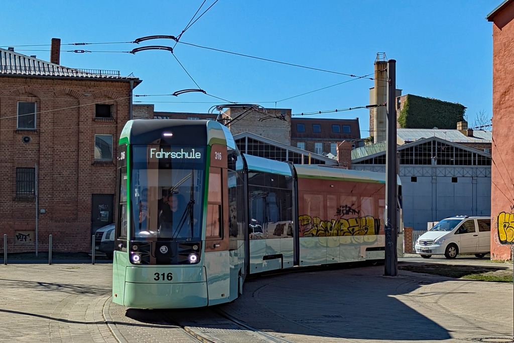 11.03.2025 - Škodawagen 316 wartet auf dem Gleis 20 des Betriebshofes