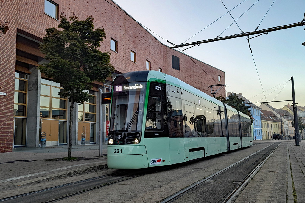 Europa-Universität und wird in Kürze als Linie 2 zum Messegelände fahren. |