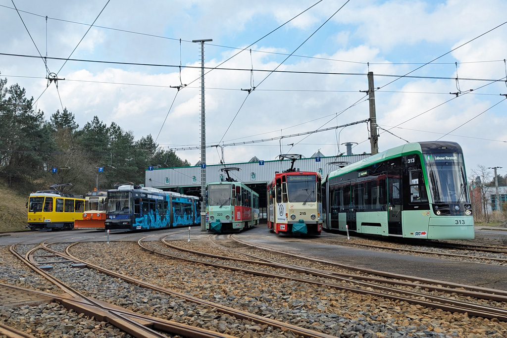 15.03.2025 - Eine Wagenparade zeigt sich hier vor den Straßenbahnhallen mit