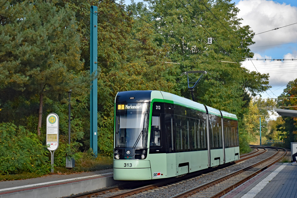 | Der Skodawagen 313 zeigt sich am 13.10.2025 an der Haltestelle Am Technologiepark. |